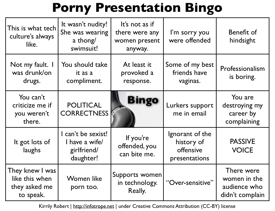 - "The topic of my talk was obvious, and I would have hoped that people who were likely to be offended would have simply chosen not to attend my talk or read my slides on the internet. It’s like complaining that television has too much material unsuitable for children, yet not taking steps to limit their viewing of it. You can’t have it both ways." -- translation: women should stay away from technical conferences -- or, hell, the whole industry! -- if they don't like being bombarded with porn.